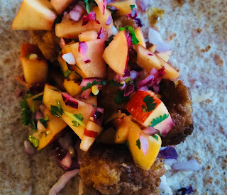 Fyld tortillas med kål og gulerødder, nektarinsalsa og fisk. Server straks.